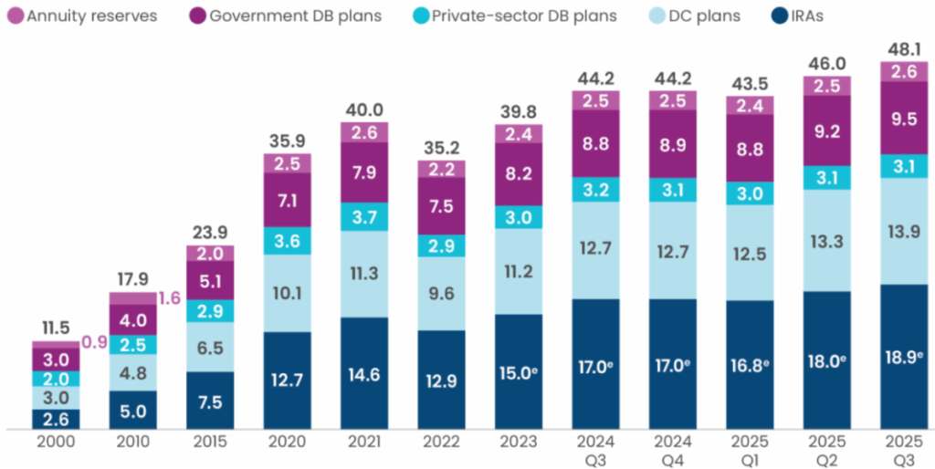 The new Investment Company Institute (ICI) numbers on the staggering amount of total wealth across all retirement plans are out. The total amount is $48.1 trillion as of 3rd quarter, 2025. Of that, $18.9 trillion is in IRA assets and $13.9 trillion is in Defined Contribution (DC) plans.